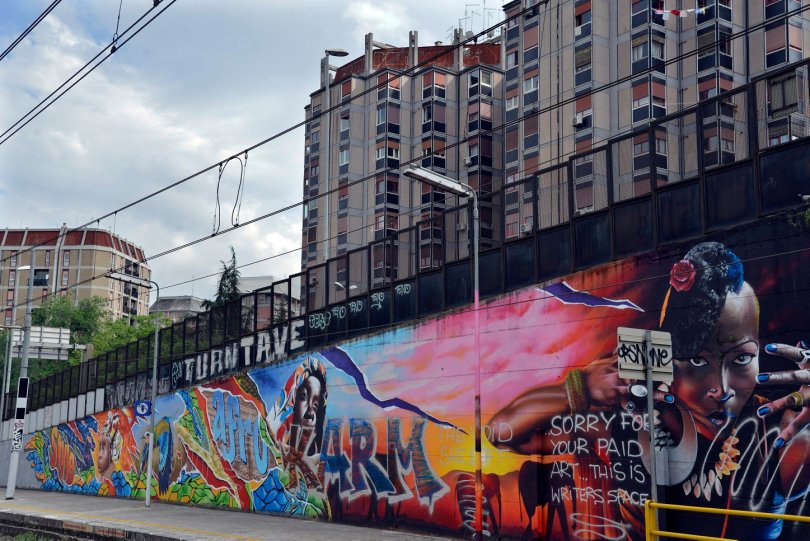 20/05/2016 Roma. I writers dichiarano guerra alla street art sui muri della stazìone Nomentana. Il murale di Marcello Mans è imbrattato per tutta la sua lungheza con spray color argento e la scritta ‘sorry for your paid art… this is writers space’: ‘spiacenti per la tua arte a pagamento… questo è spazio dei writers’. In realtà Mans, che ha operato nel quadro del progetto ‘arte in stazione’ ha avuto pagati solo i materiali.
