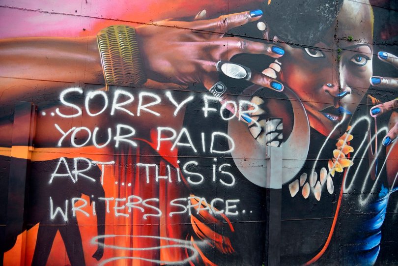 20/05/2016 Roma. I writers dichiarano guerra alla street art sui muri della stazìone Nomentana. Il murale di Marcello Mans è imbrattato per tutta la sua lungheza con spray color argento e la scritta ‘sorry for your paid art… this is writers space’: ‘spiacenti per la tua arte a pagamento… questo è spazio dei writers’. In realtà Mans, che ha operato nel quadro del progetto ‘arte in stazione’ ha avuto pagati solo i materiali.