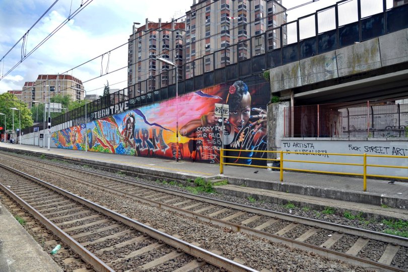 20/05/2016 Roma. I writers dichiarano guerra alla street art sui muri della stazìone Nomentana. Il murale di Marcello Mans è imbrattato per tutta la sua lungheza con spray color argento e la scritta ‘sorry for your paid art… this is writers space’: ‘spiacenti per la tua arte a pagamento… questo è spazio dei writers’. In realtà Mans, che ha operato nel quadro del progetto ‘arte in stazione’ ha avuto pagati solo i materiali.