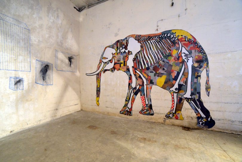 30/11/2015 Roma. Il MAAM, Museo dell’Altro e dell’Altrove a Metropoliz, ex fabbrica di salumi Fiorucci occupata nel 2009 da famiglie senza casa di varie nazionalità. Il MAAM è un progetto di Giorgio De Finis che si propone di difendere l’occupazione abitativa grazie nalla presenza di opere d’arte inamovibili. Apre il sabato ai visitatori. Elephanti in The Room, di Francesco Bancheri e Gabbie, di Leila Mirzakhani