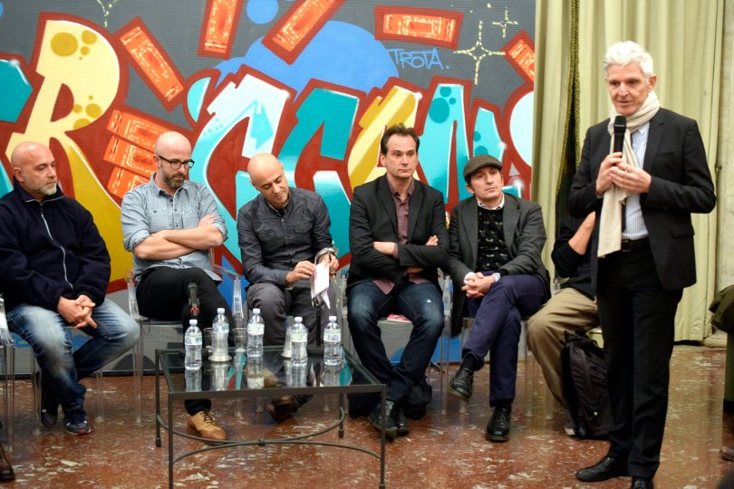 Pasolini e la Street Art, evento organizzato dall’Istituto della Enciclopedia Italiana davanti al logo Treccani reinventato dallo street artist Mathieu ‘ Trota ‘ Romeo. Mauro Pallotta, artista, Simone Pallotta, curatore, David Vecchiato, artista e curatore, Nicola Verlato, artista, Omino 71, artista, il presidente della Treccani Massimo Bray