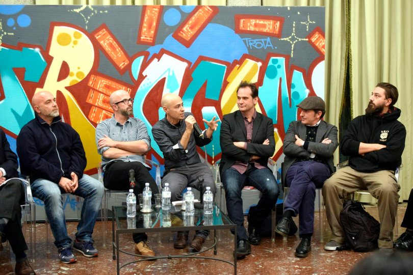 Pasolini e la Street Art, evento organizzato dall’Istituto della Enciclopedia Italiana davanti al logo Treccani reinventato dallo street artist Mathieu ‘ Trota ‘ Romeo. Mauro Pallotta, artista, Simone Pallotta, curatore, David Vecchiato, artista e curatore, Nicola Verlato, artista, Omino 71, artista, Mr. Klevra, artista