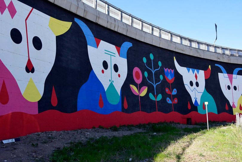 11/03/2017 Roma. Il murale di Camilla Falsini “La Vita e la Morte”, a Gregna di Sant’Andrea, via Lucio Mariani. Dai bucrani, modellati su quelli che decorano il Mausoleo di Cecilia Metella, cadono lacrime di sangue. Il murale è parte del progetto GRAart, la street art sul Raccordo Anulare, promosso da Anas, che ha visto dieci urban artist ispirarsi al mito della città eterna, con la direzione artistica di David Diavù Vecchiato e la consulenza della scrittrice Ilaria Beltramme.