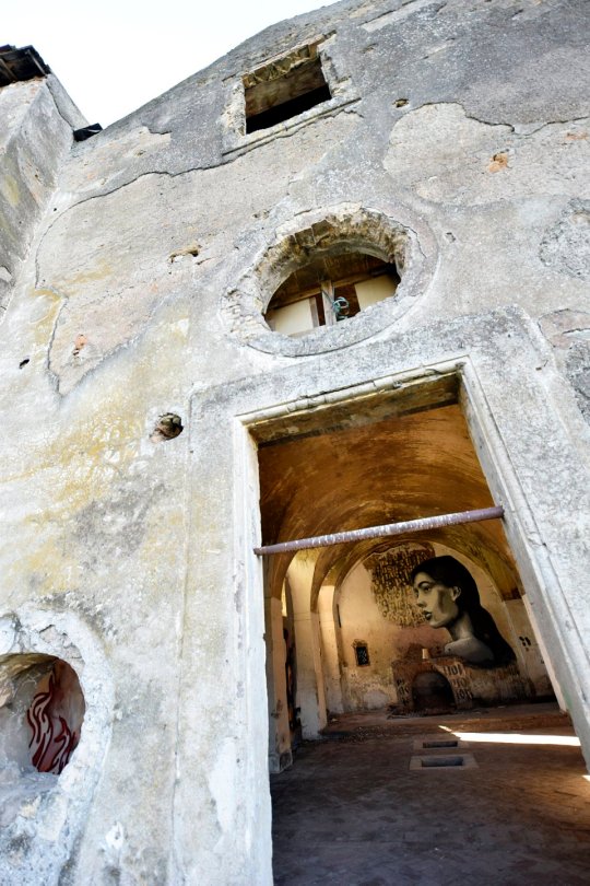 Murali nella chiesa abbandonata di Santa Maria ad Lagos, a Falcognana sulla via Ardeatina. La chiesa è parte di un casale settecentesco costruito dai Cenci su preesistenze romane e medievali. Fra il 1740 e il 1745 ospitò limmagine miracolosa della Madonna del Divino Amore, quando laffresco della Vergine con il Bambino fu asportato dalla torre di Castel di Leva, per ripararlo dalle intemperie ed esporlo alla devozione dei fedeli. Il volto di donna nellabside è opera di 0707, le rappresentazioni dei vizi capitali (gola, lussuria, avarizia, invidia, ira e accidia) sono di Other e Saviols. Lintervento è stato promosso da Fotografia Errante.
