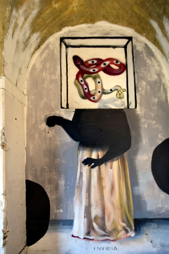 Murali nella chiesa abbandonata di Santa Maria ad Lagos, a Falcognana sulla via Ardeatina. La chiesa è parte di un casale settecentesco costruito dai Cenci su preesistenze romane e medievali. Fra il 1740 e il 1745 ospitò l’immagine miracolosa della Madonna del Divino Amore, quando l’affresco della Vergine con il Bambino fu asportato dalla torre di Castel di Leva, per ripararlo dalle intemperie ed esporlo alla devozione dei fedeli. Il volto di donna nell’abside è opera di 0707, le rappresentazioni dei vizi capitali (gola, lussuria, avarizia, invidia, ira e accidia) sono di Other e Saviols. L’intervento è stato promosso da Fotografia Errante.