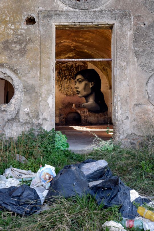 Murali nella chiesa abbandonata di Santa Maria ad Lagos, a Falcognana sulla via Ardeatina. La chiesa è parte di un casale settecentesco costruito dai Cenci su preesistenze romane e medievali. Fra il 1740 e il 1745 ospitò limmagine miracolosa della Madonna del Divino Amore, quando laffresco della Vergine con il Bambino fu asportato dalla torre di Castel di Leva, per ripararlo dalle intemperie ed esporlo alla devozione dei fedeli. Il volto di donna nellabside è opera di 0707, le rappresentazioni dei vizi capitali (gola, lussuria, avarizia, invidia, ira e accidia) sono di Other e Saviols. Lintervento è stato promosso da Fotografia Errante.