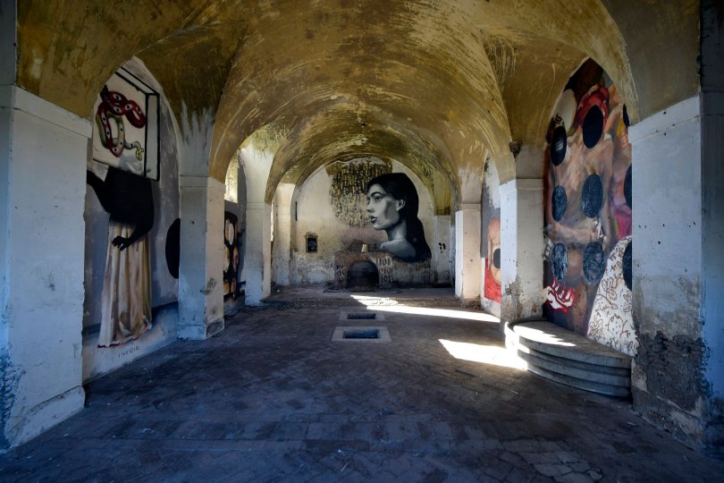 Murali nella chiesa abbandonata di Santa Maria ad Lagos, a Falcognana sulla via Ardeatina. La chiesa è parte di un casale settecentesco costruito dai Cenci su preesistenze romane e medievali. Fra il 1740 e il 1745 ospitò l’immagine miracolosa della Madonna del Divino Amore, quando l’affresco della Vergine con il Bambino fu asportato dalla torre di Castel di Leva, per ripararlo dalle intemperie ed esporlo alla devozione dei fedeli. Il volto di donna nell’abside è opera di 0707, le rappresentazioni dei vizi capitali (gola, lussuria, avarizia, invidia, ira e accidia) sono di Other e Saviols. L’intervento è stato promosso da Fotografia Errante.
