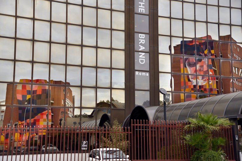 09/02/2017 Roma. I murali dipinti sulle facciate dell’hotel Roma Aurelia Antica e del Convention Center dagli artisti Moneyless (Teo Pirisi) e Salvo Ligama, in un progetto curato da Stefano Antonelli e Francesca Mezzano di 999Contemporary. Il dittico “Don’t care” di Salvo Ligama riflesso in un palazzo prospicente