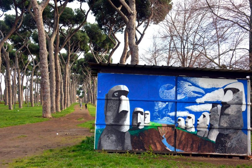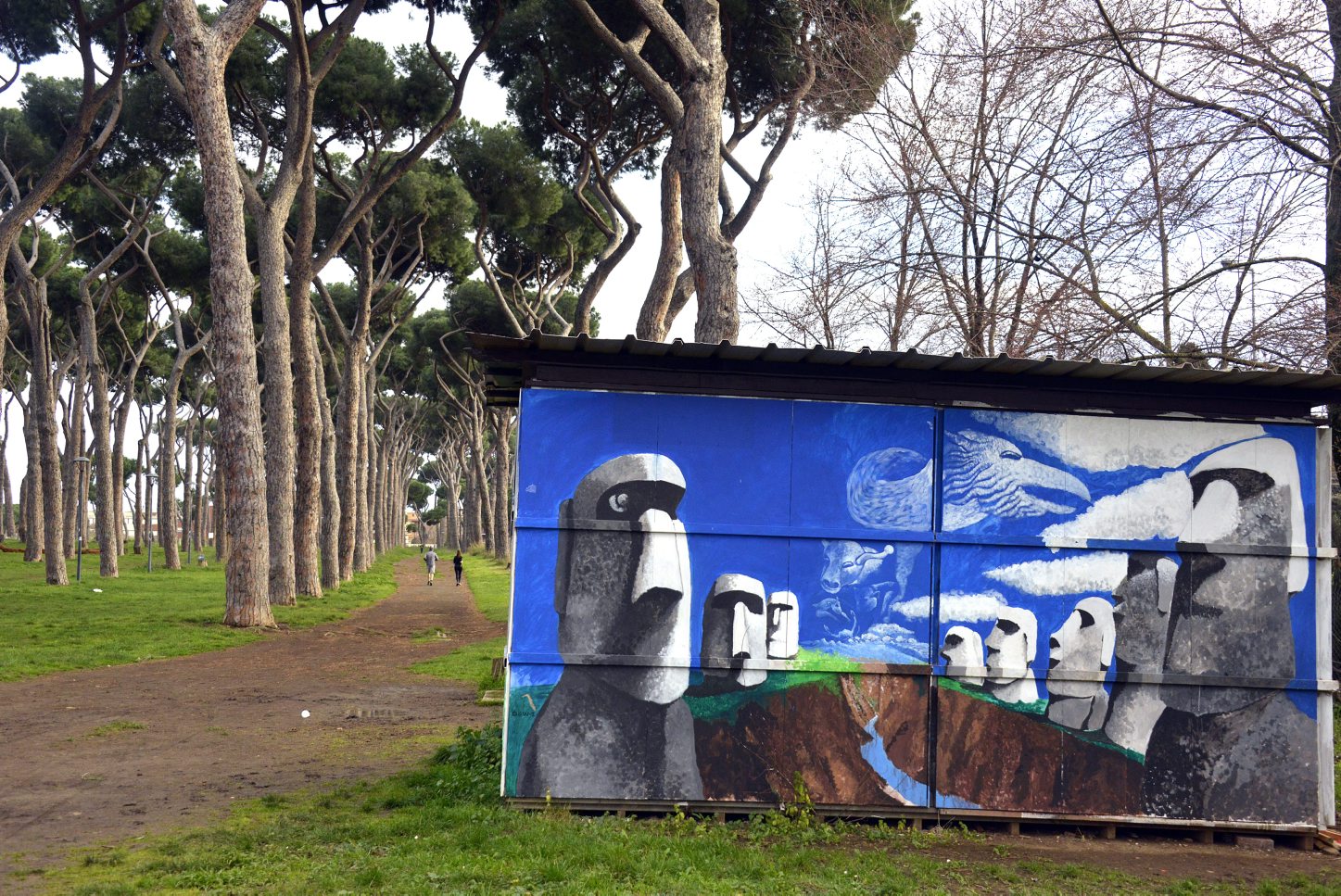 15/02/2016 Roma. Street Art nel XIII municipio. Una prospettiva dell’isola di Pasqua con le teste Moai nel murale di Chew-Z alla Pineta Sacchetti, nel quadro del progetto Pinacci Nostri, a cura di Lello Melchionda