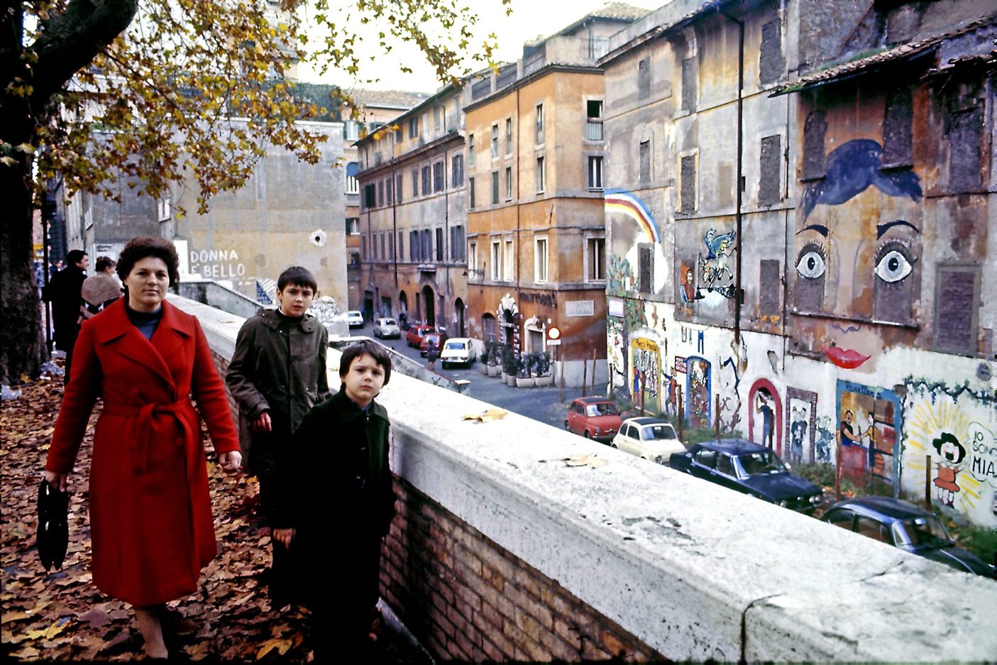 Via di Tor di Nona, 1977. Collettivo L’Asino che vola: grandi murali su lotta per la casa e appropriazione del quartiere da parte dei ceti popolari.